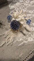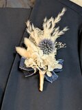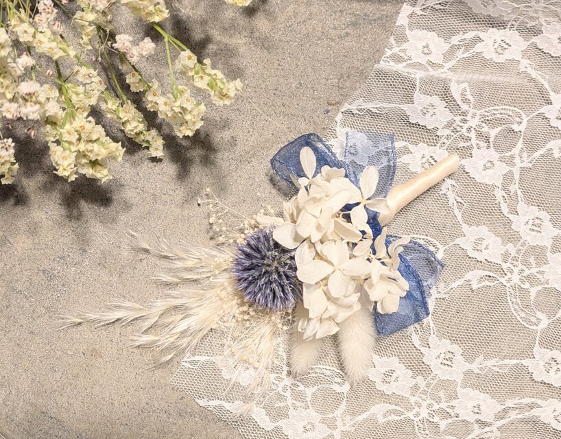 瑠璃玉アザミの綺麗なブルーとパンパスやラグラス、アナベルのホワイトを使ったコサージュです。