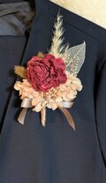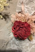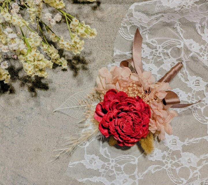 ソラフラワーの赤とパンパスやラグラス、アナベル(ブリザーブドフラワー)を使ったコサージュです。