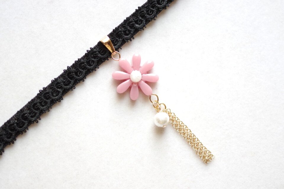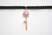 こっくりしたピンクのお花モチーフのレジンを、ベルベットリボンにタティングレースで装飾を施したチョーカーに仕上げました。