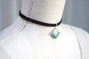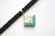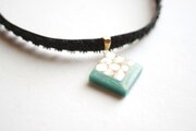 ホワイトシェルのさざれを沈め、光沢のあるグリーンで囲ったレジンを、ベルベットリボンにタティングレースで装飾を施したチョーカーに仕上げました。