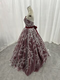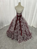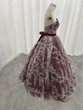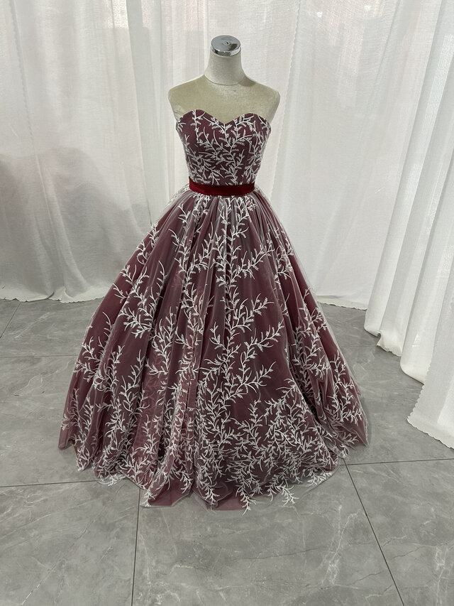 上品!カラードレス ボルドー色 ベアトップ リーフ刺繍 贅沢な総レース ロング Aライン 披露宴