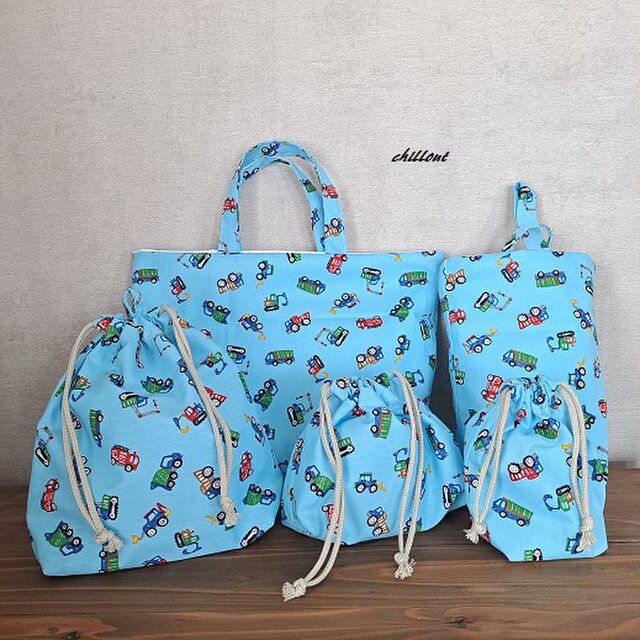 働く車柄の入園バッグ5点セットが出来上がりました!
