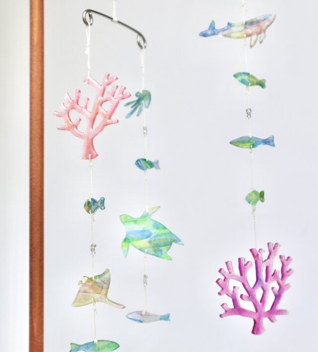 モビール もびーる ぷらばん ぷら板 プラ板 インテリア つやつや 部屋飾りガラス調 魚 珊瑚 クジラ くじら えい ウミガメ サカナ水族館 海中 魚好き 涼やか 癒し 自然 リラックス 壁掛け かべ掛け 雨 吊るし飾り イベント ガーランド ゆらゆら ピンク 水色 青 緑 絵本 ギフト 赤ちゃん 立体 新築 手描き mobile interior ornament green clear purple yellow fish coral whale sea summer hydrangea interior ornament