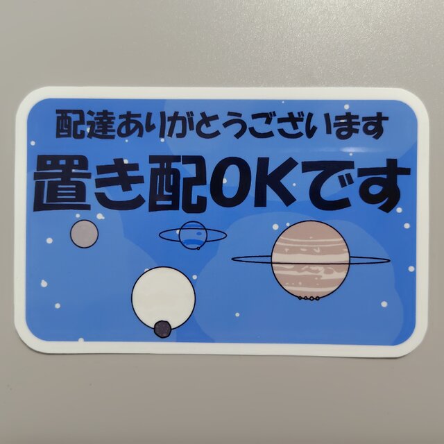 星空に太陽系惑星をあしらった置き配のステッカーを作ってみました。