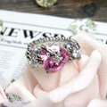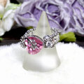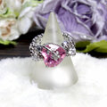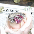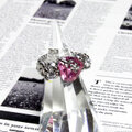 このリングは、可憐さと豪華さを兼ね備えた一品。中央に輝く大粒のハート型ジルコニアは、見る者の心を瞬時に捉えます。ピンクのジルコニアが一輪の花に乗ったデザインは、まるで指先に咲く美しい花のよう。光を受けて煌めく姿は、特別な日の装いを一層引き立てます。