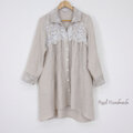 襟元、前立て、袖口にリネンエンブロイダリー刺繍をあしらった、