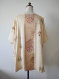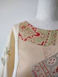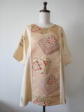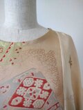 左右の生地は着物だった物、ポップで愛らしい柄を活かしたく何度もトライしようとしては組み合わせたい色もピンとこず、これだけでは弱い気がして出してはしまうを繰り返していました。今回、見つけた帯の色味がピッタリだったので柄も素材も異なる織物と正絹の着物生地とを組み合わせて創ったチュニックとなります。