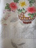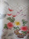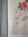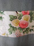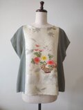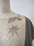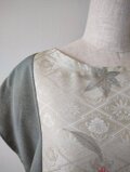 光沢のある白地に素敵な地模様とシルバー使いもあるお洒落な花模様、以前にワンピースを仕立てた振袖だった残りの生地ですが、今回はドット柄の小紋とを組み合わせたトップスとなります。