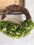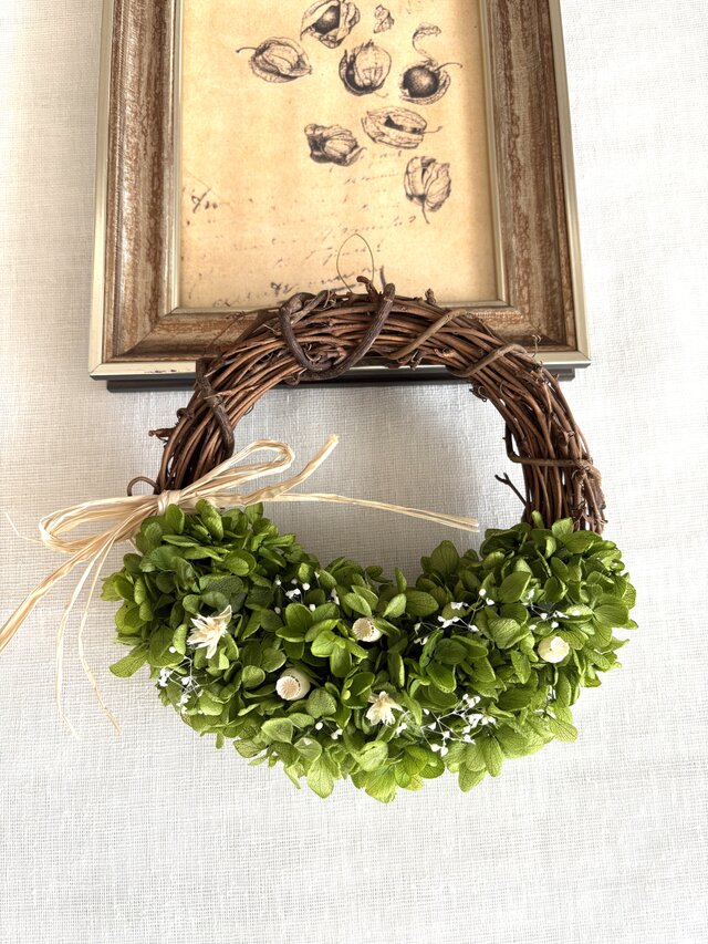 これから訪れる新緑の季節にピッタリの鮮やかなグリーンが綺麗な、とても素敵なリースです。親切丁寧なご対応、お心遣い等、本当にありがとうございました。大切に飾り、癒やされたいと思います。これからも素敵な作品を楽しみにしています。