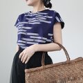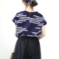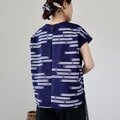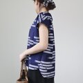 古い浴衣反物から作ったゆったり身幅のフレンチ袖ブラウスです。紺の地に白抜きのトンボ模様。前より後ろ裾が少し長いデザインです。Tシャツ感覚で気軽にご着用ください。