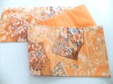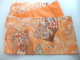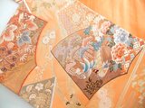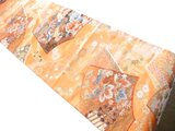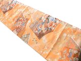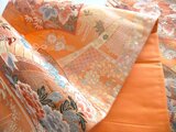 ■普通仕立てでしっかりした帯地オレンジ色地に鴛鴦(おしどり)と花草文様です。華やかな色合いで高級感ある文様です。