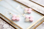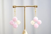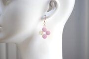 不透明なピンクの粒を三つ、そしてお花にパール、ブリオンを沈めた透明の粒を一つアクセントに連ねた、可憐なピアスです。