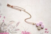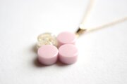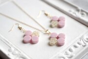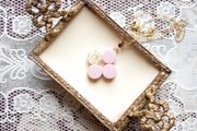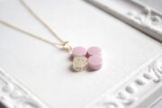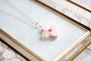 不透明なピンクの粒を三つ、そしてお花にパール、ブリオンを沈めた透明の粒を一つアクセントに連ねた、可憐なペンダントです。