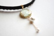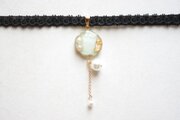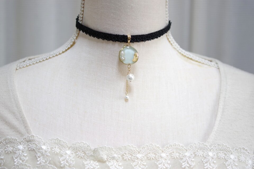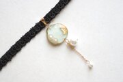 金箔と淡水パールを沈めたスライスアゲートのようなレジンを、ベルベットリボンにタティングレースで装飾を施したチョーカーに仕上げました。