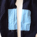 深みのある藍染無地が印象的で、日本の古布ならではの落ち着いた色合いと風合いを感じられる一着です。状態は良好で、フロント内側には当て布による補強も見られ、実用性の高さもうかがえます。