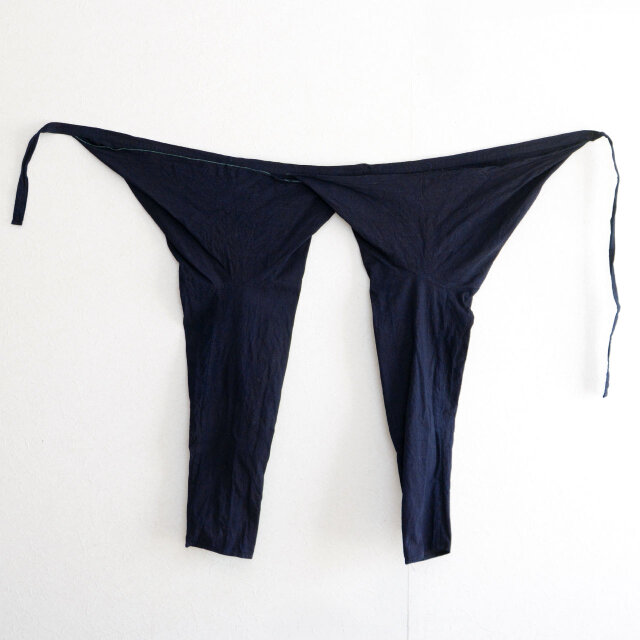 身体に密着させて着用することで動きを妨げず、布の余りが出ない合理的な形状となっています。紐で結んで調整する仕様は、体型や用途に合わせた柔軟さを持ち、当時の生活道具としての機能美を感じさせます。
