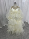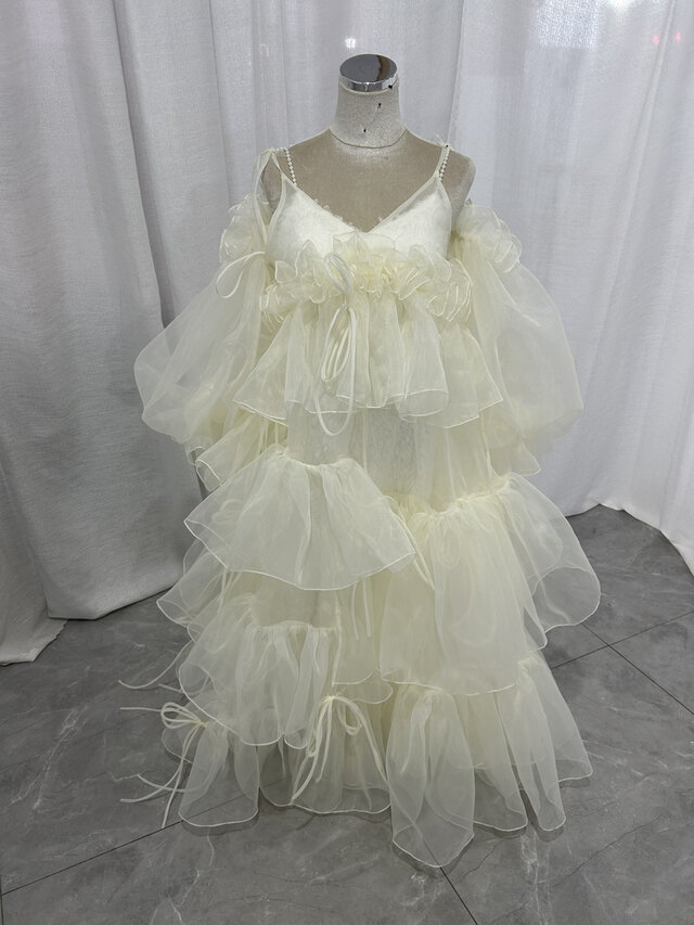 パーティードレス 薄シャンパンの色 キャミソール ラッフルフリル 背中見せ ふわふわドレス 披露宴