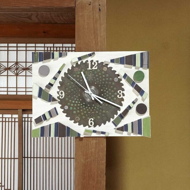 時計盤には古民家の廃材など薄い板、窓枠などを利用して新しい感覚に作り変えました。