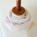 さらウール*WOOLSILK*薄桜色×青竹色*ウールシルクストール品のある柔らかな色合いと艶のストールに惹かれました。 どれも素敵でかなり迷いましたが、2枚購入致しました。 春になり服装が軽くなりますので、このストールをつけるのが楽しみです。 金属のネックレスが苦手なので、ストールがアクセントになります。 大切に致します。 素敵なストールをありがとうございます。