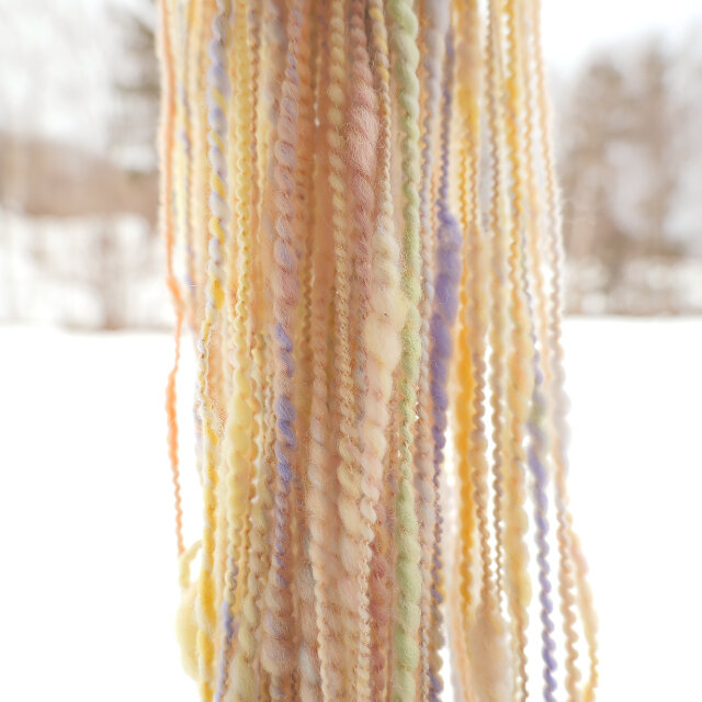 とっても綺麗です!色んな色が合わさってながめているだけでもワクワクします!手紡ぎの風合いが大好きなので、何を作るかはこれからじっくり考えます!タイトルも素敵で、詩的だなぁ~と思いました!ありがとうございました!