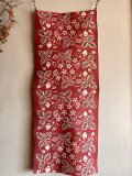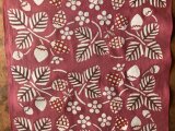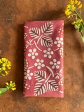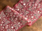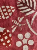 ベースは植物染料のスオウと染料化柿渋の混色で濃いめのピンク色に染めました。そしてスオウとエンジュでイチゴ、柿渋で葉っぱに差し色いれてます。滲みも味わいと捉えていただけると幸いです。