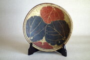 この作品は、信楽の土を用いてろくろで成形した大皿を、緩やかな四方に仕上げています。蕗の葉は手描きで丁寧に加彩し、焼成を重ねて完成させています。周囲に施したヘラ目や裏面の絵付けにも、手仕事ならではの味わいが感じられます。金の縁取りが落ち着いた色合いにさりげない華やかさを添えています。
