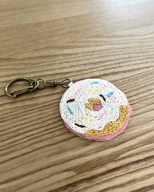 カラフルなスプレーチョコのトッピングがポイント 刺繍で作ったモチーフをキーホルダーにしました