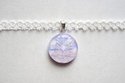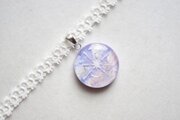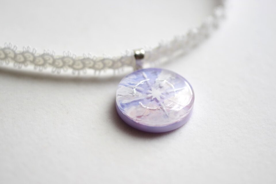 明け方の紫色の雲と昇る朝日の光線を描きこんだレジンを、ベルベットリボンにタティングレースで装飾を施したチョーカーに仕上げました。