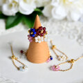 小さな天然石を花のようにあしらい、中央のゴールドビーズが上品なアクセントになっています。