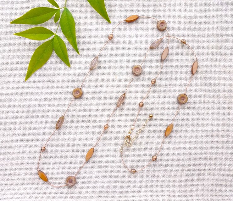 5種のビーズの色合いが美しく、マスタード基調の 素敵なネックレスで、大変気に入りました。 大事に使わせて頂きます。ありがとうございました。