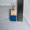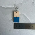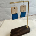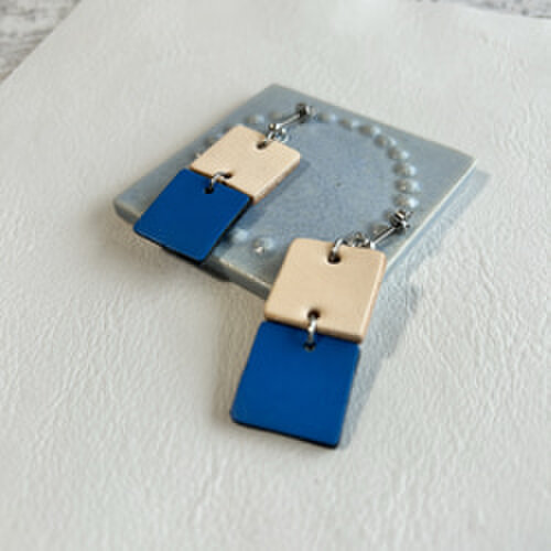 このピアスは、ヌメ革と鮮やかなブルーカラーの牛本革を組み合わせた、2連の四角形が耳元で優雅に揺れるデザインです。
