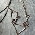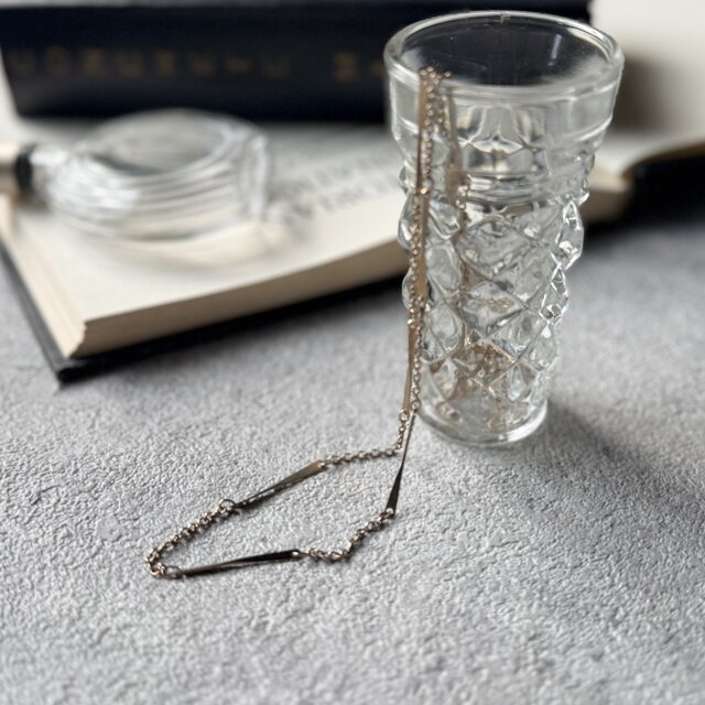 ゴールドトーンのバー&リンクチェーンネックレス。規則的に並んだストレートバーと、繊細なリンクチェーンの組み合わせデザインが特徴的です。