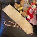 柔らかなベージュの地に、緻密な幾何学文様が情報の欠片のように織り込まれたベルト。ピンクの帯紐が、優美なシグナルを添え、纏う人の品格を最適化します。