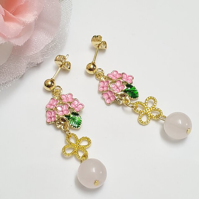 優しいピンク色が魅力のローズクォーツと可憐な花のチャームを合わせた上品なピアスです。