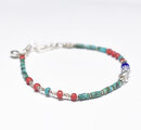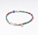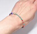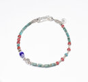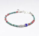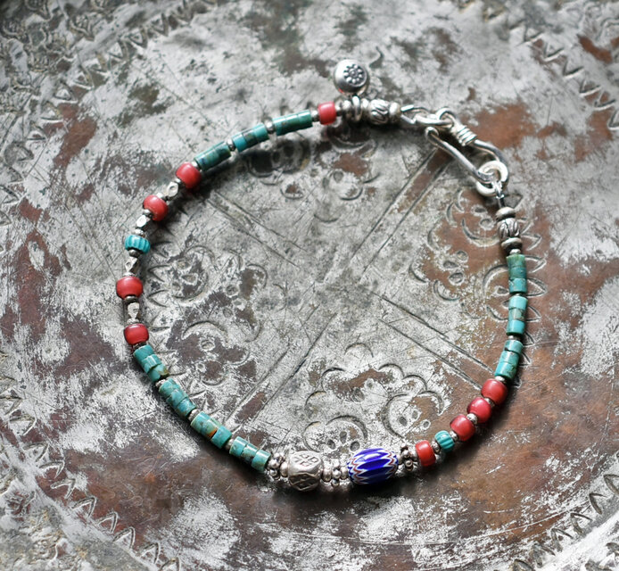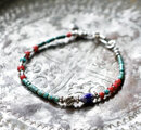 グリーンターコイズと金赤ホワイトハーツ 、ブルー&ターコイズブルーシェブロン、カレンシルバーを繋いだ華奢なブレスです。