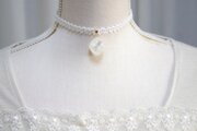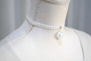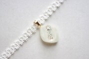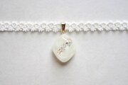 あたたかみのあるオフホワイトを背景に天の川のようにラメを一筋走らせたシンプルなレジンを、サテンリボンにタティングレースで装飾を施したチョーカーに仕上げました。