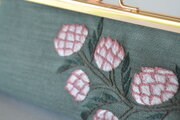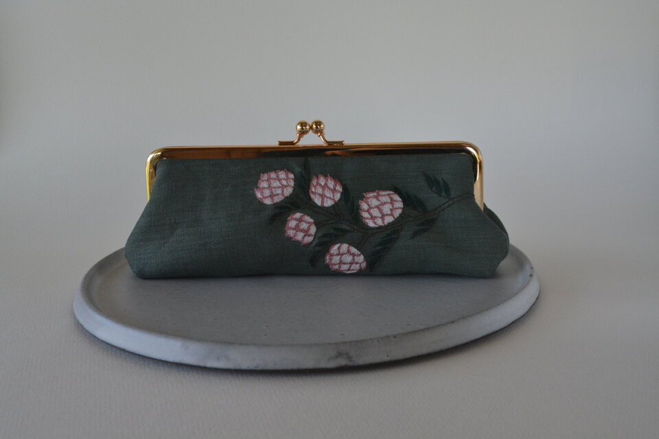 お化粧ポーチとしてこちらを選びました。実際に手にすると想像以上に刺繍が素晴らしく、ミモザのお花はもちろん葉っぱまで愛らしい。。。素敵なお買い物が出来ました