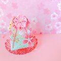 ・日本の伝統工芸技法「つまみ細工」で作った桜の花をあわせました。花びら一枚一枚を丁寧に手作りしています