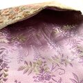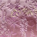 藤色を基調とした金襴地に草花文を配した藤の花の織柄です。藤色は古来より高貴さや優美さを象徴する色彩であり、特に日本文化においては気品と静謐さを表す色として認識されてきました。文様は細やかな連続性を持ち、全面に均質に広がることで、視覚的な安定感と静かな広がりを演出しています。織りによる陰影の変化が光の角度によって微細に変容し、単色に見えながらも豊かな表情を持つ点が特徴です。