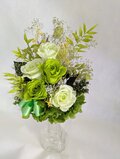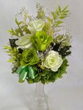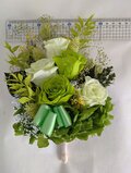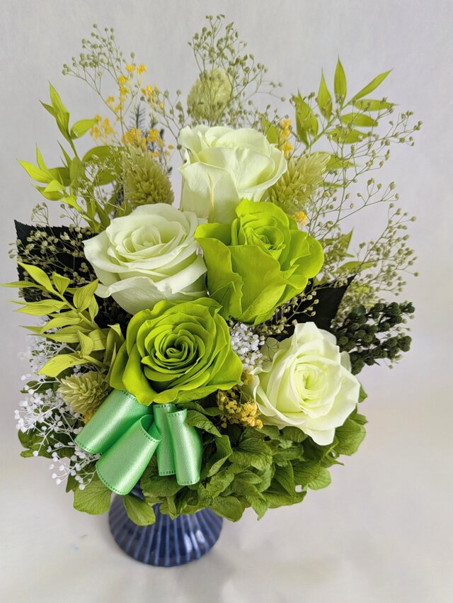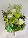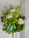プリザーブドフラワーのグリーンローズに葉物や小花などグリーンをメインにしながら華やかにたばねました。