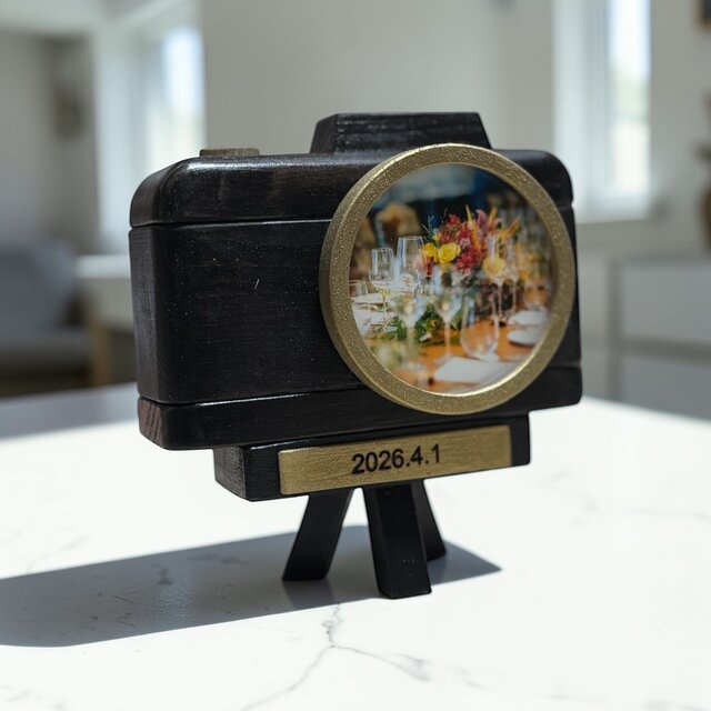 2. 名入れプレート刻印:カメラ下部のゴールドプレートに「2026.4.1」といった記念日や、お名前、短いメッセージを刻印いたします。
