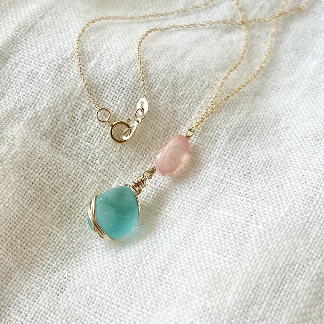 《14kgf》桜貝と海色シーグラスの自己を律するのネックレス 45cm