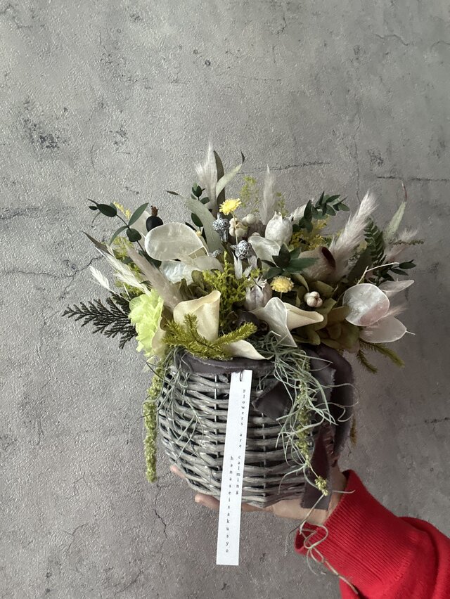 *生花、ドライフラワー、プリザーブドフラワーは自然素材の為、十分に気を付けて梱包致しますが、運送中の揺れにより、種や葉や花が少し落ちる場合がございます。ご理解いただけますと、ありがたく存じます。