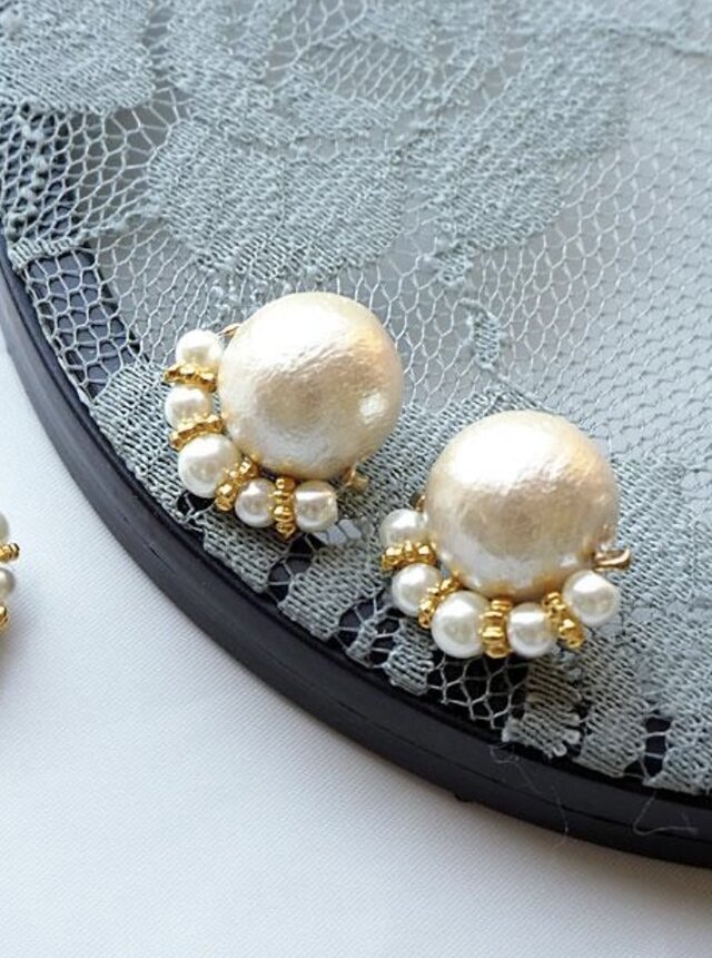 ふんわりと柔らかなアイボリーの色味のコットンパールに小粒パールとゴールドパーツを合わせました。