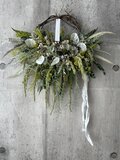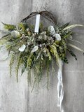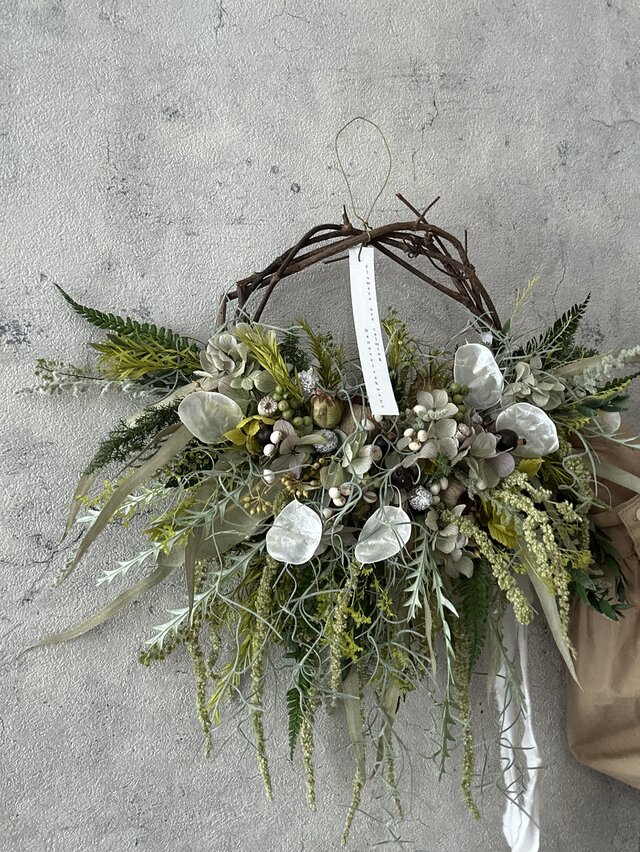 サイズ約32×35㎝色々な緑を楽しむためのプリザーブドフラワーのリースです。色んな日々の中でグリーンを目に留めて少し深呼吸してまたゆっくり進んでいただけるような癒されていただきたい気持ちで作っています。たくさんの植物を集めて形にしたら生命が宿ったような動きが作れました。グリーン系が目に優しいです。ドライならではのナチュラル感をお楽しみください。適した環境は涼しめの光が当たりにくい暗い場所が1番いい状態を長く保ちます。次に日陰です。