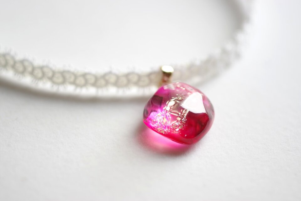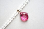 複数の赤とピンクが滲みあい奏でるハーモニーが美しいレジンを、サテンリボンにタティングレースで装飾を施したチョーカーに仕上げました。