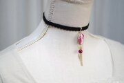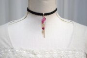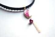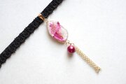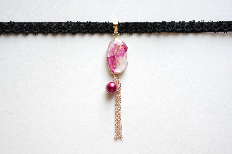 スライスアゲートのような光沢のある白いレジンにピンクの模様を描き、ガラスパールとフリンジを添え、ベルベットリボンにタティングレースで装飾を施したチョーカーに仕上げました。