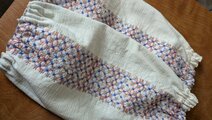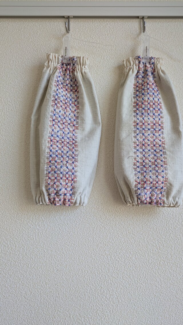 白のコットン生地にピンク系の段染め糸で、紫陽花模様を刺しました。