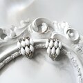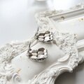 シルバートーンの土台にクリアなラインストーンを配し、その下にドロップ型のミルクガラスをあしらった、エレガントなデザインが特徴です。