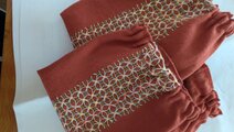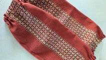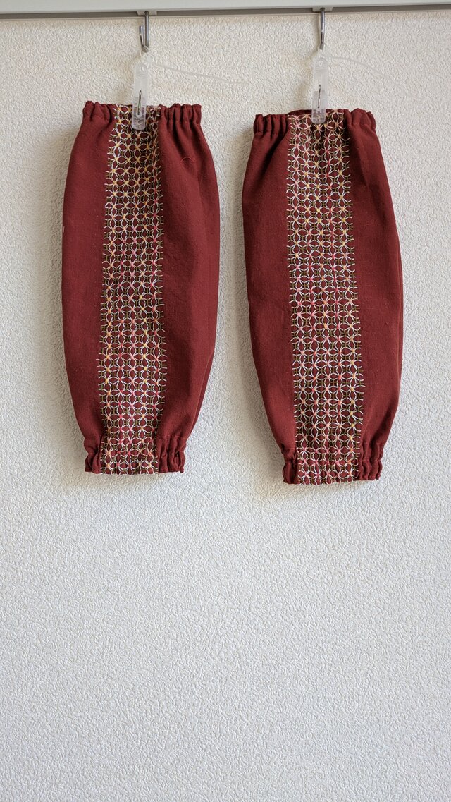 レンガ色の生地に、水色系の糸で、紫陽花模様を刺しました。